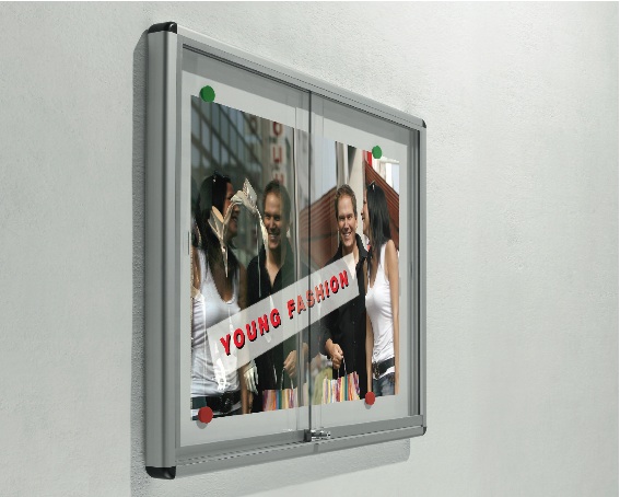 Info-Vitrine, Schiebetüren aus Sicherheitsglas, rollengelagert, Rückwand Stahl-Email-weiß magnethaftend, Rahmen aus formschönem Aluminium, ohne Montage