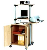Mehrzweckwagen 1 Einbauschrank (2 Türen, 1 Einlegeboden), 2 Längsplatten, 1 Querplatte Außenmaße (cm): Wagen: 70B x 141H x 55T Schrank: 57B x 70H x 50T Vielseitig und extrem variabel ist diese neue Generation von Mehrzweck- und Projektorwagen. Durch eine spezielle Klemmvorrichtung können Böden, Zusatzplatten und sogar Schränke absolut variabel in der Höhe fixiert werden. Konstruktive Grundlage ist ein 2-Säulen- Rundrohrgestell (Ø = 60 mm) mit 4 leicht laufenden Rollen, von denen 2 feststellbar sind. Alle Einstellungen sind frei wählbar, sowohl in der Höhe als auch im Winkel. Arbeitsplatten sind als Quer- und Längsböden und als zusätzliche Ablageplatten lieferbar. Standard-Dekor: U016-lichtgrau Standardfarbe Stahlgestell: RAL9006 weißaluminium