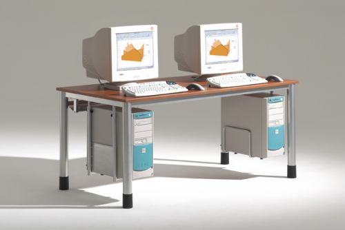 EDV-Tisch mit offenem Kabelkanal. Die Kabelzuführung erfolgt über Kunststoff-Rosetten in der Oberplatte.