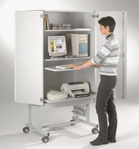 EDV-Wagen mit Tastaturauszug und einem verstellbaren Einlegeboden über dem Monitorfach.