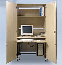 Dieser große zweitürige Computerwagen mit integriertem Stahlrahmengestell bietet Sicherheit und Mobilität für eine vielseitig nutzbare Computeranlage. 4 leicht laufende Rollen, von denen die beiden vorderen feststellbar sind, gewährleisten einen einfachen und sicheren Transport. Hinter den beiden um 260° drehbaren Türen präsentiert sich ein vollwertiger PC-Arbeitsplatz. Für den Rechner ist im unteren Schrankteil ein separater CPU-Kasten eingebaut, Tastatur und Maus liegen auf einem großen leichtgängigen Auszug auf Rollenführung. Der Monitor steht auf einem eigenen Trägerboden. Im oberen Schrankbereich wurde ein zusätzlicher Einlegeboden für Handbücher, Datenträger, Arbeitsunterlagen und Materialien montiert. Die Türen lassen sich um 260° öffnen und besitzen eine Dreipunktverriegelung mit Zylinderschloss. Die Schrankrückwand wurde zur besseren Wärmeableitung der Geräte verkürzt. Zum Lieferumfang gehört eine 4fach Steckdosenleiste mit ca. 5 m langer Zuleitung. Außenmaße (cm): 100 B x 180 H x 67 T Alle Holzteile aus schadstoffarmen melaminharzbeschichteten Spanplatten in E1-Qualität. Plattenstärke: 19 mm Standard-Dekor: U 016 – lichtgrau Alle Stahlgestelle pulverbeschichtet Standard-Farbe: RAL 7035 – lichtgrau Farbmusterpalette im Kapitel 22 bei den technischen Daten. Bei Sonderfarben beachten beachten Sie bitte die Aufpreise.