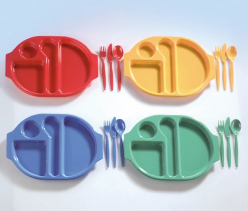 Großes Speise-TablettMaße: 38 x 28 cmUnterteilung wie abgebildetDas Besteck passt in die mittlere Aussparung,Länge des Messers ca. 20 cm.Farbe: Blau12 große Tabletts im Set