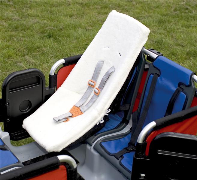 Der Sitz kann in 2 Stufen eingestellt werden: Für Babys unter 6 Mon. wird der Sitz in der flachen Position eingestellt, dann sind 2 Sitze belegt und es passen 2 Sitze in den Kinderbus. Für Babys ab 6 Mon. ist die Einstellung wie abgebildet. Mit Fellbezug (Baumwoll-Misch-Gewebe).