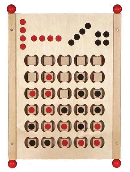 Für 1 bis 2 Kinder, ab 4 Jahren.Das Wandelement Vier Gewinnt ist eine form- und farbschöne Großversion des bekannten Strategiespiels. Feinmotorik, Auge-Hand-Koordination, Farbenerkennung, Zuordnung, Geschicklichkeit, Konzentration, graphomotorische Bewegungsabläufe. Spiel und Didaktik/Edukation, Therapie, Warteraum, Besucherbereich.