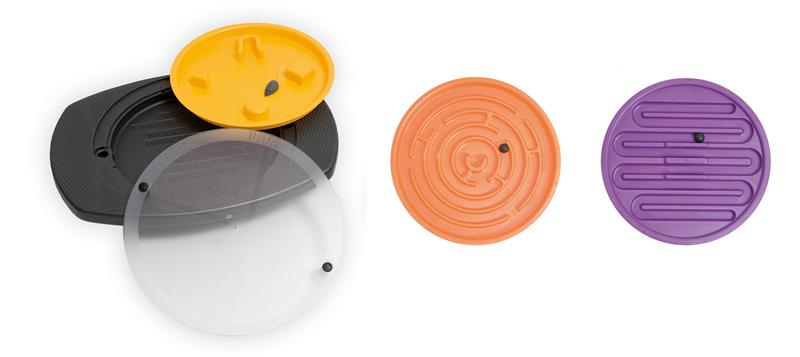 Basis mit 3 wechselbaren Einsätzen: Lila Zickzack, orangefarbiges Tauruslabyrinth mit 1 Hartgummikugel, gelbes Maus-Spiel mit 1 Kugelmaus, inkl. Anleitung.Für größere Standsicherheit und Bewegungskontrolle gibt es optional als Zusatzausrüstung strapazierfähige, verstellbare Haltegurte in zwei unterschiedlichen Längen. Die Haltegurte werden an extra dafür vorgesehenen Einkerbungen an beiden Seiten des Balanco eingehakt.