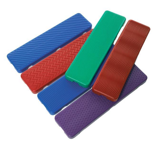 Das Set besteht aus 6 Balance-Kontur-Elementen, jedes 52 cm lang, 14 cm breit und 4 cm hoch, mit vier rutschhemmenden Gummikugelfüßen, hergestellt aus hochwertigem Kunststoff in Blastechnik in einem Guss. Sechs verschiedene topologisch conturierte Oberflächen: schlangenförmige Längswellen, Zick-Zack Muster, Diagonal- und Querrillen, kleine, massageintensive Noppen und sanfte, runde Noppen. Bis 120 kg belastbar, nicht geeignet für Kinder unter 3 Jahren. Für Barfußbenutzung, leicht zu reinigen (auch mit Desinfektionsmitteln), mit Anleitung.Jedes Element hat eine andere Oberflächenstruktur, die unterschiedliche, taktile Reizimpulse und sensorische Stimulation bewirken. Hinzu kommt ein wechselnder Massageeffekt und die schönen, klaren Farben bieten zusätzliche optische und visuelle Reize und können in viele wahrnehmungsaktive und therapeutische Aktionen eingebunden werden. Besonders innovativ ist die Ausstattung mit 2 Verbindungsclips an jedem Element, jeweils an den schmalen und an den langen Seiten. So lassen sich zahlreiche Verbindungsmöglichkeiten herstellen, mit mehreren Sets ergeben sich herausfordernde Balance-, Kontur- und Tastwege, die sicher und stabil verbunden sind. Ideal für die Bereiche Psycho-)Sensomotorik, Wahrnehmungsintegration, Therapie und Rehabilitation, Kinder- und Seniorengymnastik.