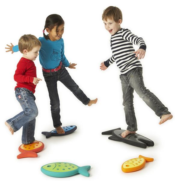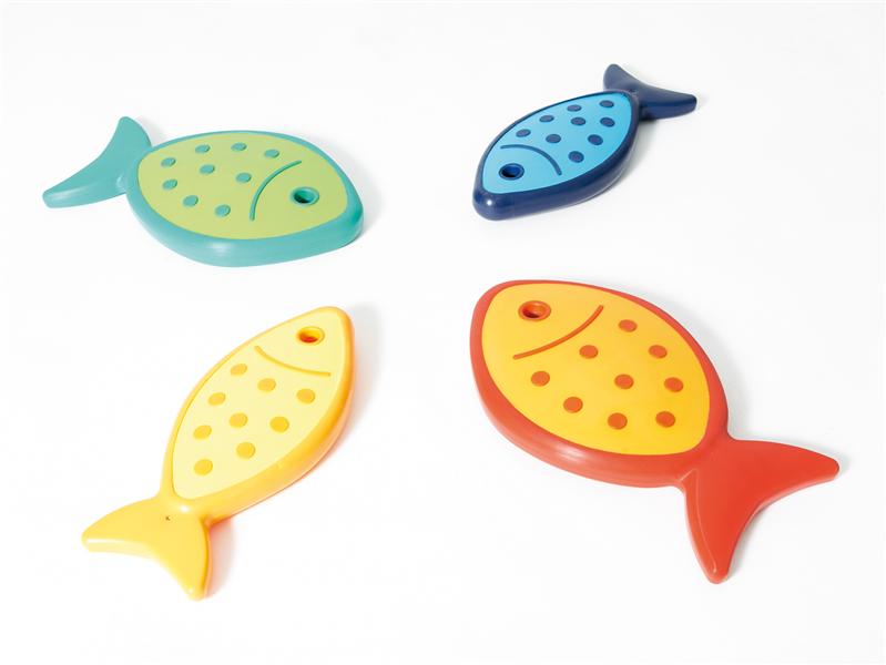Ein Set lustiger, farbenfroher Fische mit einem aufblasbaren, soften Unterteil und einer harten Kunststoffoberfläche mit rutschfester Kunstgummi-Struktur. Die harte Oberfläche sorgt für einen sicheren Halt, während das aufblasbare Unterteil den Bewegungen des Kindes folgt. Motorik und Gleichgewicht werden gefordert, weil ständig Anpassungen in Fußgelenken und Beinen vorgenommen werden, um das Gleichgewicht zu halten. Die Fische können als Trittsteine im freien Spiel oder als Teil strukturierter Aktivitäten eingesetzt werden. Der Luftdruck wird mit der mitgelieferten Ballpumpe reguliert. Satz mit 4 Fischen: 2 große Fische (L 38 cm, B 22 cm, H 4,5 cm), 2 kleine Fische (L 34 cm, B 15 cm, H 4,5 cm), in den Farben Rot, Grün, Gelb und Blau. Für Kinder ab 3 Jahren, Maximalgewicht 75 kg.