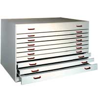 Zeichnungs- und Bilderschrank mit 10 Auszügen. Zeichnungen, Pläne und Bilder bis zu einer Größe von 125 x 90 cm können Sie in diesem Spezialschrank sicher und weitgehend staubfrei aufbewahren. Alle Auszüge laufen auf Rollenführungen, seitliche Aufkantungen rundum verhindern ein Verrutschen oder Verklemmen Ihrer Dokumente. Standard-Dekor: U016 lichtgrau Außenmaße(cm): 140B x 85H x 98T Optional ist der Schrank auch mit einer Zentralverriegelung erhältlich.