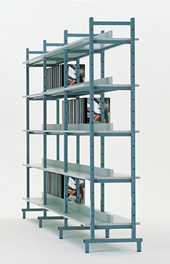 Freistehend, d.h. von beiden Seiten bestückbar. Die Böden sind 50 cm tief, mit Mittelsteg. Jeder Fachbo den ist 95 cm breit und endlos aneinander montierbar. Grundele ment 101 cm breit, jedes weitere 98 cm breit. Die Gesamthöhe der Seitenholme beträgt 200 cm. Je Element werden 5 Böden mitgeliefert, die mit Stahl rahmen verstärkt und dadurch außergewöhnlich belastbar sind. Die Böden sind in der Höhe 10 cm verstellbar.