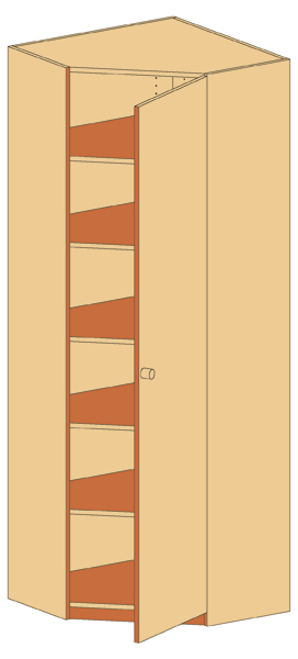 Außenmaße (cm): 80B x 230H x 80T, Anstellseite = 40 cm Eck-Schrank 1 Tür, abschließbar, 5 Diagonal-Einlegeböden
