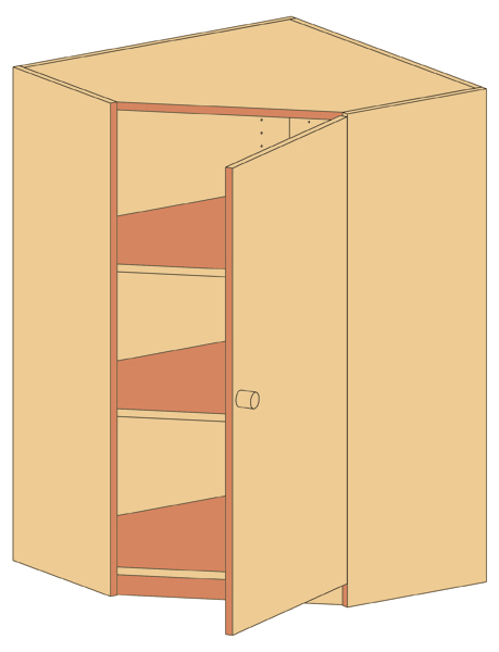 Außenmaße (cm): 80B x 120H x 80T, Anstellseite = 40 cm Unter-Eckschrank 1 Tür, abschließbar, 2 Diagonal-Einlegeböden