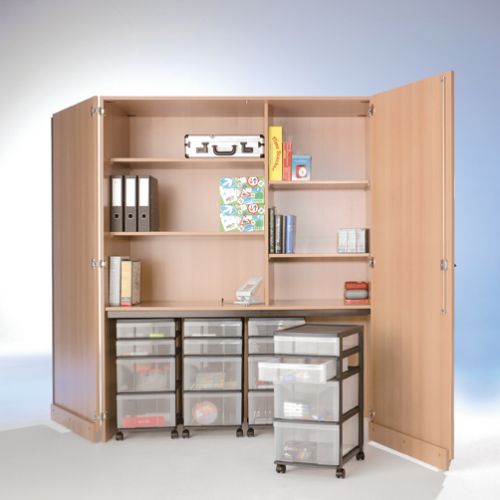 Schrank „LEG 11 D“B/H/T: 150 x 190 x 50 cm, Innenmaß oben links 87 cm,oben rechts 57,5 cm, Garagenteil Innenhöhe 68 cm,Im Lieferumfang enthalten, 4 fahrbare Schubladencontainer B/H/T