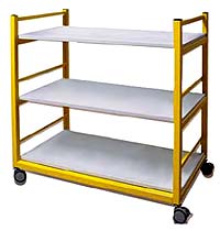 Ablagen sind ohne Aufkantungen. Außenmaße(cm): 90B x 90H x 50T Transportwagen mit 3 Ablageflächen in einem stabilen Stahlrahmengestell mit 4 leicht laufenden Doppelrollen, von denen die beiden vorderen feststellbar sind. Die Ablagen sind wahlweise als glatte Platten oder als Platten mit einer mittleren Aufkantung (besonders geeignet für Büchertransporte) lieferbar.