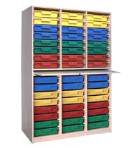 Dreireihiger hoher Materialcontainer mit Sockel und Tablarauszug, Sichtrückwand in Nut und Feder verleimt, 19 mm stark, mit 3x16 flachen herausnehmbaren Kunststoffschübe auf Kunststoffschienen gleitend, farblich sortiert. Außenmaße(cm): 105B x 160H x 50T Standard-Dekor: Buche hell