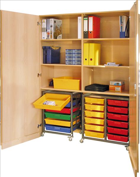 Maße (cm): 150B x 190H x 50T Materialschrank 2 Türen, abschließbar, mit Schleppsockel, oben: Mittelwand, 4 Einlegeböden, unten: 1 fahrbares Stahlregal mit 6 flachen breiten Kunststoffschüben und 1 fahrbares Stahlregal mit je 2 x 6 flachen schmalen Kunststoffschüben