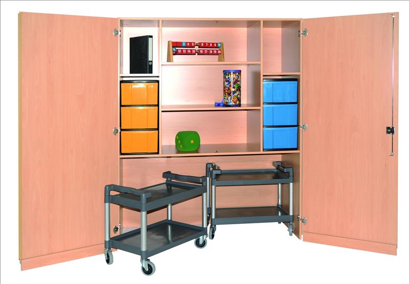 Maße (cm): 150B x 190H x 60T Materialschrank 2 Türen mit Schleppsockel, abschließbar, unten: 2 fahrbare Transportwagen mit 2 Ablageebenen, darüber: 1 fester Fachboden, oben: 2 Trennwände, 2 x 2 Einlegeböden, 2 Modulboxen H3F0 mit je 3 hohen Kunststoffschüben