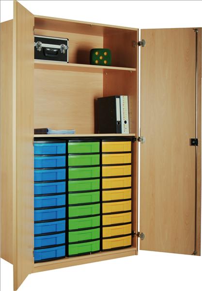 Maße (cm): 95B x 190H x 50T Materialschrank 2 Türen, abschließbar, unten: 3 Modulboxen H0F9 mit je 9 flachen Kunststoffschüben, oben: 1 Einlegeboden