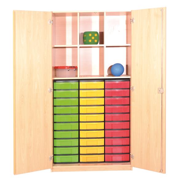 Maße (cm): 95B x 190H x 50T Materialschrank 2 Türen, abschließbar, unten: 3 Modulboxen H0F10 mit je 10 flachen Kunststoffschüben, oben: 2 Trennwände, 3 x 1 Einlegeboden