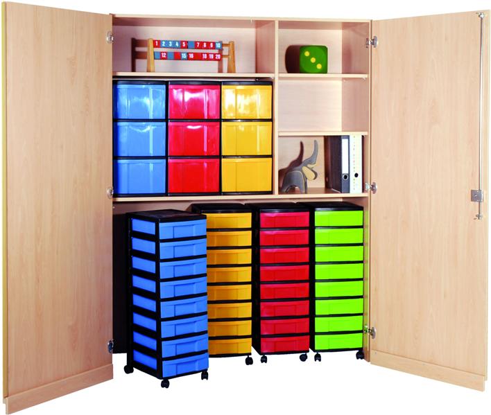 Außenmaße (cm): 150B x 190H x 50T Materialschrank – extrabreit 2 Türen mit Schleppsockel, abschließbar, unten: 4 fahrbare Modulboxen H0F8F mit je 8 flachen Kunststoffschüben, darüber: 1 fester Fachboden, oben: 1 Trennwand, 2 x 2 Einlegeböden, 3 Modulboxen H3F0 mit je 3 hohen Kunststoffschüben