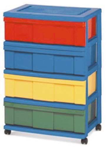Kunterbunter Ordnungswagen mit blauem Rahmen.