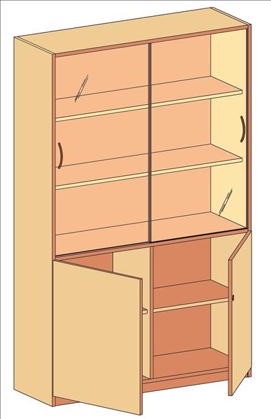 Außenmaße (cm): 120B x 190H x 40T Schrank oben: 2 Glasschiebetüren, 2 Einlegeböden, unten: 2 Türen, Mittelwand, 2 x 1 Einlegeboden
