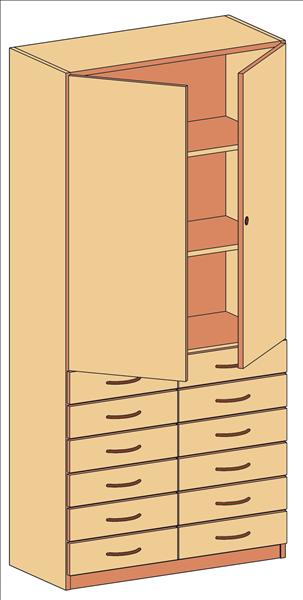 Außenmaße (cm): 90B x 190H x 40T Schrank oben: 2 Türen, 2 Einlegeböden, unten: 2 x 6 Schubkästen
