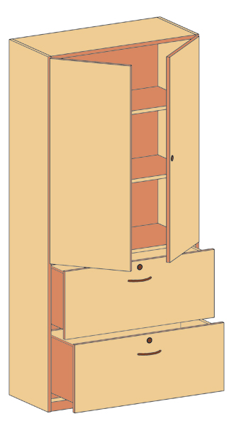 Außenmaße (cm): 90B x 190H x 50T Schrank oben: 2 Türen, 2 Einlegeböden, unten: 2 Schubkästen