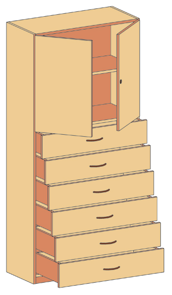Außenmaße (cm): 90B x 190H x 50T Schrank oben: 2 Türen, 2 Einlegeböden, unten: 6 Schubkästen