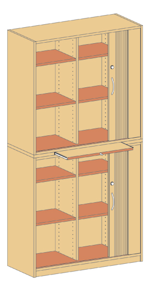 Außenmaße (cm): 100B x 190H x 50T Schrank (4,5 OH) mit 2 horizontal laufenden Jalousien, abschließbar, Tablarauszug, Mittelwand, 2 x 4 Einlegeböden