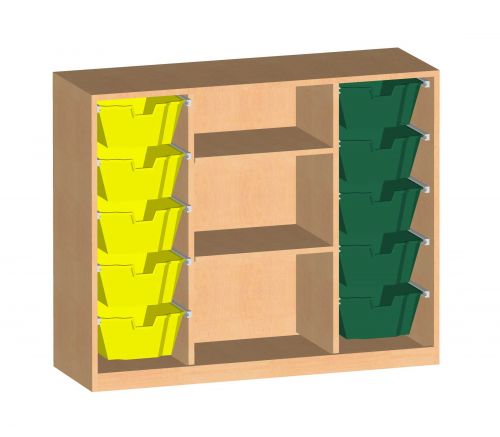 Mit Sockel, mit je 5 SymBox „deep“, farbig sortiert, links und rechts vom Regalteil
