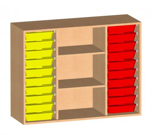 Ohne Sockel, mit je 10 SymBox „flat“, farbig sortiert, links und rechts vom Regalteil