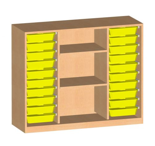 Mit Sockel, mit je 10 SymBox „flat“, farbig sortiert, links und rechts vom Regalteil