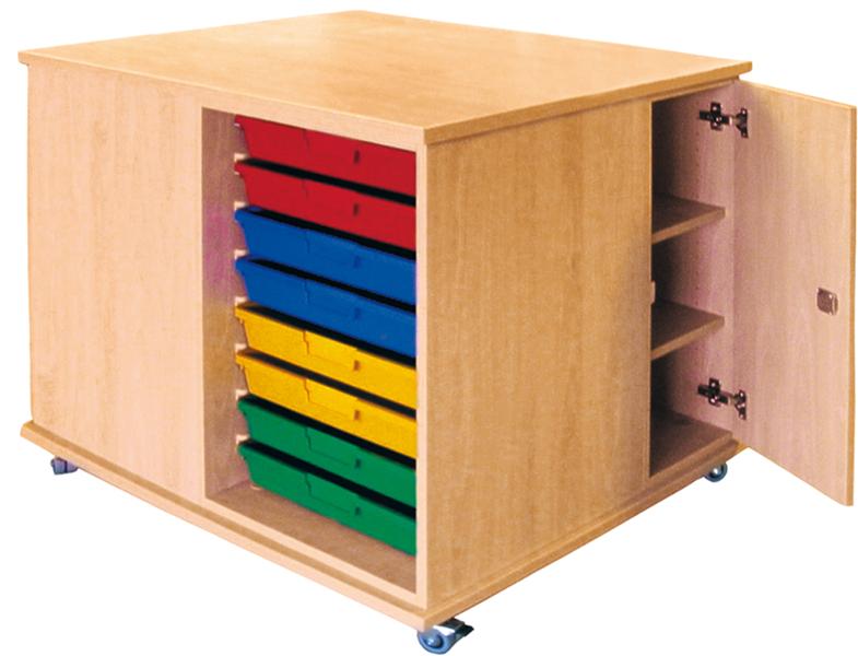 Außenmaße (cm): 107B x 88H x 85T Fahrbare Containerinsel bestehend aus 2 diagonal gegenüber liegenden Fächern mit je 8 flachen, breiten Kunststoffschüben (DIN A3) und 2 diagonal gegenüber liegenden Schrankfächern, abschließbar, mit je 2 Einlegeböden