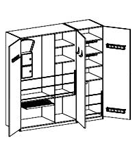 Sportgeräteschrank 3 Türen, abschließbar, 2 Trennwände, 3 Ballfächer mit Gitter, Reifenhalter, Wertfach, separat abschließbar, Verbandskasten, abschließbar, Gerätehalter aus Draht, 6 Einlegeböden, 2 davon mit Unterhängekorb, mit Keulenauszug Außenmaße(cm): 190B x 190H x 50T
