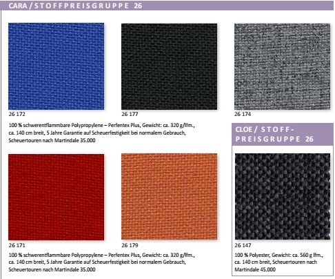 Stoffpreisgruppen 26/30 Wählen Sie Ihren Stoff aus unserer gesamten Stoffkollektion aus. Alle Stoffe sind objekttauglich.