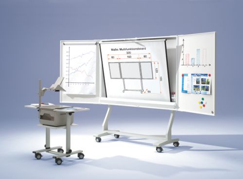 Aluminiumprofil. Standardmäßig mit einer ausziehbaren Projektionswand und Flipchart-Klemme.