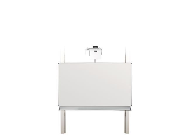 Ein paar Pylonensäulen mit Kontergewichten zur Boden- und Wandmontage, Tafel mit matter weißer Stahloberfläche, beschreibbar mit Whiteboardmarkern und trocken abwischbar, 3 x 1,2m für Projektion im 16:10 Format, Projektorhalterung in Höhe und Tiefe verstellbar, Universalanschraubplatte zur Aufnahme aller gängigen Ultranahdistanzprojektoren, interaktiver Mimio Ultranahdistanzprojektor, bedienbar mit elektronischem Stift, ein interaktiver MimioProjector mit 2.500 ANSI Lumen und WXGA Auflösung 16:10