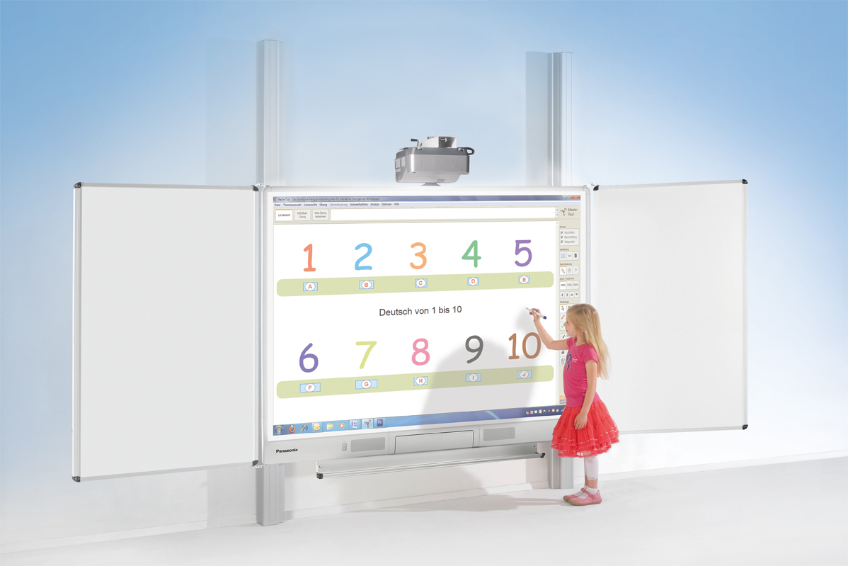 Mittelfläche interaktives Panasonic Board, Oberfläche: Hartfaserplatte mit Melaminbeschichtung, Interaktivität durch kapazitiven Berührungssensor, bedienbar mit 3 Fingern und/oder Stiften gleichzeitig, Lautsprechersystem im Rahmen integriert, inkl. Software Easiteach, Projektorhalterung,Fahrbares Gestell, Höhenverstellungssystem Federzugmechanismus, Ultranahdistanzbeamer, Panasonicbeamer PT-CW 230 Auflösung: W-XGA 1280 x 800