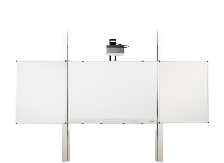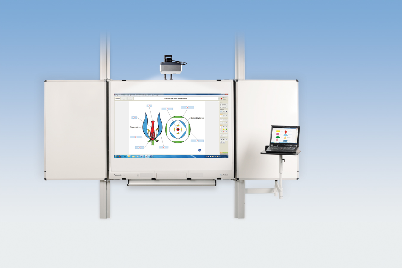 Mittelfläche interaktives Panasonic Board, Oberfläche: Hartfaserplatte mit Melaminbeschichtung, Interaktivität durch kapazitiven Berührungssensor, bedienbar mit 3 Fingern und/oder Stiften gleichzeitig, Lautsprechersystem im Rahmen integriert, inkl. Software Easiteach, Projektorhalterung,Ein paar Pylonensäulen mit Kontergewichten zur Boden- und Wandmontage, Ultranahdistanzbeamer,