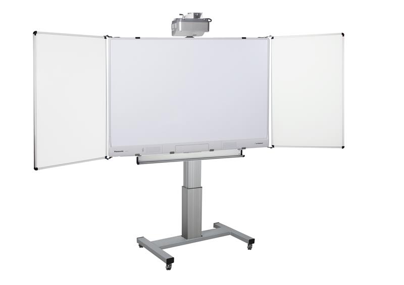 Mittelfläche interaktives Panasonic Board, Oberfläche: Hartfaserplatte mit Melaminbeschichtung, Interaktivität durch kapazitiven Berührungssensor, bedienbar mit 3 Fingern und/oder Stiften gleichzeitig, Lautsprechersystem im Rahmen integriert, inkl. Software Easiteach, Projektorhalterung,Fahrbares Gestell, Höhenverstellungssystem elektrische Pylone, Ultranahdistanzbeamer, Panasonicbeamer PT-CW 230 Auflösung: W-XGA 1280 x 800