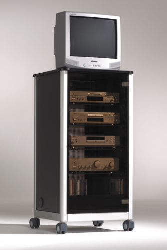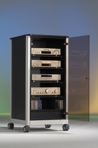 Serienmäßig mit Tür aus Rauchglas, zum Fernbedienen der Geräte. Mit 4 Laufrollen, davon