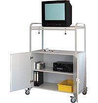 Dieser vielseitig einsetzbare Medienwagen ist mit einem zweitürigen Videoschrank ausgestattet, der in ein offenes Stahlrahmengestell integriert wurde. Das Gestell ist mit 4 leicht laufenden Rollen ausgestattet, von denen die beiden vorderen feststellbar sind. Die obere Platte kann durch 2 Gewindestangen mit Sterngriffen geneigt werden. Im Schrankteil liegt serienmäßig ein höhenverstellbarer Einlegeboden. Er kann optional durch einen Geräteauszug und/oder einen Videokassettenauszug mit Kassettenhalter (jeweils auf Rollenführung) ergänzt werden. Die Türen lassen sich um 260° öffnen und besitzen eine Dreipunktverriegelung mit Dreholive und Zylinderschloss. In der Schrankrückwand befindet sich ein Ausschnitt für die Kabelführung der Geräte. Zum Lieferumfang gehört eine 4fach Steckdosenleiste mit ca. 5 m langer Zuleitung. Außenmaße (cm): 106 B x 130 H x 64 T Geräteschrank: 100 B x 65 H x 50 T Oberplatte: 100 B x 1,9 H x 50 T