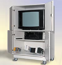 Der viertürige Medienwagen bietet eine Trennung von TV- und Gerätefach durch separat verschließbare Türen und erhöht damit die Sicherheit der technischen Geräte. Der Wagen hat ein im Sockel verdeckt montiertes Stahlrahmengestell mit 4 leicht laufenden Rollen (Ø = 10 cm). Die beiden vorderen Rollen sind feststellbar. In seinen wesentlichen Konstruktionsmerkmalen ist er weitgehend baugleich mit dem Medienwagen auf Seite 1.3. Das TV-Fach wird durch eine untermontierte Stabilisierungsstrebe verstärkt. Im unteren Schrankteil liegt serienmäßig ein höhenverstellbarer Einlegeboden. Er kann optional durch einen Geräteauszug auf Rollenführung ersetzt oder ergänzt werden. Ein Videokassettenauszug auf Rollenführung mit Kassettenhalter kann zusätzlich über dem Schrankboden eingebaut werden. Die Türen lassen sich um 260° öffnen und besitzen eine Dreipunktverriegelung mit Zylinderschloss. Die Schrankrückwand wurde zur besseren Wärmeableitung der Geräte verkürzt. Zum Lieferumfang gehört eine 4fach Steckdosenleiste mit ca. 5 m langer Zuleitung. Außenmaße (cm): 100 B x 175 H x 60 T TV-Fach: 95 B x 65 H x 54 T Videofach: 95 B x 80 H x 54 T Alle Medienwagen aus schadstoffarmen melaminharzbeschichteten Spanplatten in E1-Qualität. Plattenstärke: 19 mm Standard-Dekor: U 016-lichtgrau Alle Stahlgestelle pulverbeschichtet Standard-Farbe: RAL 7035-lichtgrau bei Sonderfarben aus der Farbmusterpalette beachten Sie bitte die Aufpreise.