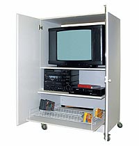 Dieser zweitürige Medienwagen hat ein im Sockel verdeckt montiertes Stahlrahmengestell. Von den 4 leicht laufenden Rollen (Ø=10cm) sind die beiden vorderen feststellbar. In seinen wesentlichen Konstruktionsmerkmalen ist er weitgehend baugleich mit dem Medienwagen 1066 6100 10. Das TV-Fach wird durch eine untermontierte Stabilisierungsstrebe verstärkt. Das Fach kann bei Bedarf von uns nach Ihren Angaben in der Höhe vergrößert werden. In diesem Fall wird der Boden nach unten versetzt. Im unteren Schrankteil liegt serienmäßig ein höhenverstellbarer Einlegeboden. Er kann optional durch einen Geräteauszug auf Rollenführung ersetzt oder ergänzt werden. Ein Videokassettenauszug auf Rollenführung mit Kassettenhalter kann zusätzlich über dem Schrankboden eingebaut werden. Die Türen lassen sich um 260° öffnen und besitzen eine Dreipunktverriegelung mit Zylinderschloss. Die Schrankrückwand wurde zur besseren Wärmeableitung der Geräte verkürzt. Zum Lieferumfang gehört eine 4fach Steckdosenleiste mit ca. 5 m langer Zuleitung. Außenmaße (cm): 100 B x 175 H x 60 T TV-Fach: 95 B x 65 H x 54 T Gerätefach: 95 B x 80 H x 54 T Alle Medienwagen aus schadstoffarmen melaminharzbeschichteten Spanplatten in E1-Qualität. Plattenstärke: 19 mm Standard-Dekor: U 016-lichtgrau Alle Stahlgestelle pulverbeschichtet Standard-Farbe: RAL 7035-lichtgrau Bei Sonderfarben beachten Sie bitte die Aufpreise.