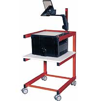 Projektorwagen mit 3 Aktionsebenen und C-Fuß-Gestell. Durch Wechseln der Platte kann der Projektor für Arbeiten im Stehen auf die obere Ebene oder für Arbeiten im Sitzen auf die mittlere Ebene gestellt werden. Vier Rollen (zwei davon feststellbar) gewährleisten einen leichten Transport. Außenmaße(cm): 48B x 75H x 56T