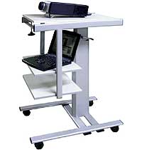 Stufenlos höhenverstellbarer Projektorwagen. Die Höhenverstellung von 100 - 145 cm erfolgt mittels Handkurbel. Die stabile Hubsäule steht außermittig auf dem fahrbaren Untergestell. Die Projektorstandplatte (BxT = 44x65cm) ist neigungseinstellbar mittels Regulierschraube. Unterhalb der Projektorstandplatte sind zwei zusätzliche Ablageplatten (BxT = 44x35cm) befestigt, die vielseitig nutzbar sind. Außenmaße(cm): 50B x 67T, Höhe 100-145 cm