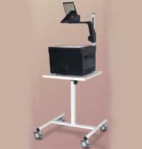 Stufenlos höhenverstellbarer Projektorwagen, Höhenverstellung mittels Sterngriffklemmschraube. Die stabile Hubsäule steht mittig auf dem fahrbaren Untergestell. 4 leicht laufende Doppelrollen (2 davon feststellbar) garantieren leichten Transport. Standard-Dekor: U 016-lichtgrau Standard-Gestellfarbe: RAL 7035-lichtgrau Außenmaße(cm): 56B x 56T, Höhe von 65 bis 110