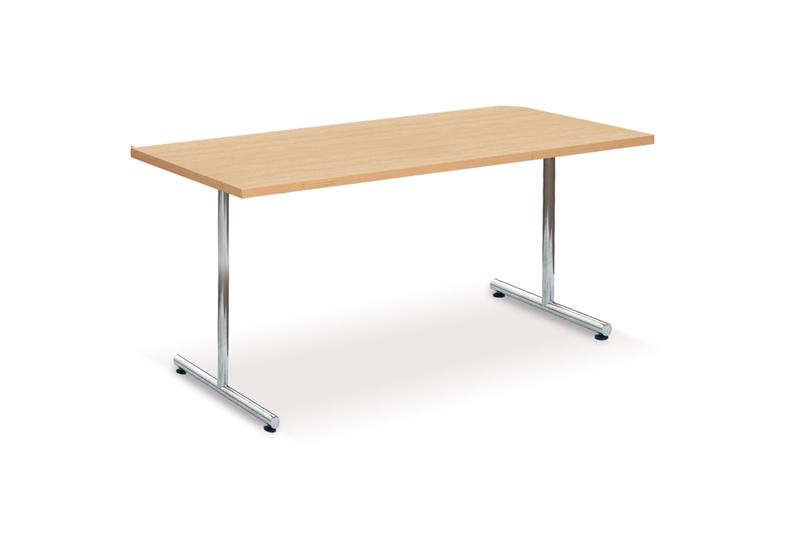 Klapptisch mit Stapelpuffern, verchromtes D1 Säulenrohrgestell, mit geradem Auslegern und Kunststoffbodengleitern mit höhenverstellung. 25mm starke melaminharzbeschichtete Tischplatte mit 2 mm starkem ABS Umleimer, Tischhöhe 72 cm