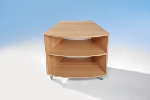 Kurviger Schrank aus melaminbeschichteter Spanplatte.