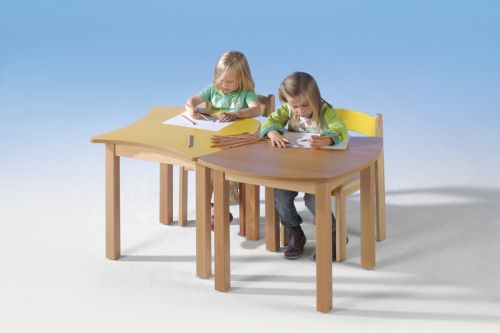 Die Tischplatte ist in fröhlichen Dekoren erhältlich, die Kante ist immer in Buche.